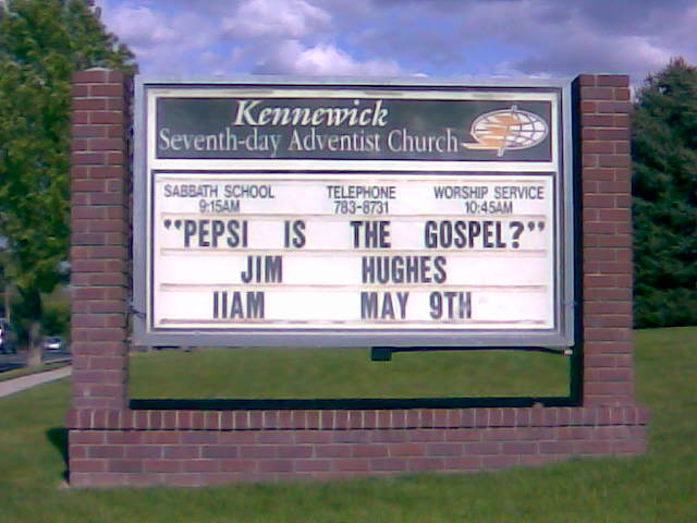 I’m just not sure what to make of this one…  I know “gospel” means “good news” and perhaps for some people having a Pepsi would indeed be good news, particularly those of this congregation, who we all know is food obsessed.  Is Pepsi something other than the soft drink I used to drink in my younger years?  I just don’t know.  The only encouraging thing for me is that question mark at the end, possibly indicating that even Jim Hughes doesn’t know what he’s talking about.