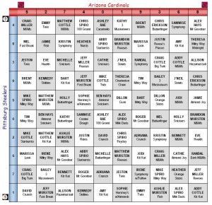 For example, if Pittsburg scores first, say a field goal, the score would be 3-0 Pittsburg. The person that has the square representing 3 for Pittsburg and 0 for Arizona (that is Cathie) wins a candy bar. Then suppose Arizona scores a touchdown, making the score 6 Arizona, 3 Pittsburg: the person that has that score (Addy) wins a candy bar. Then Arizona kicks the extra point, so then the person that has the score 7-3 for Arizona (Michelle) wins a candy bar. If the first quarter then ends, Michelle wins another candy bar for having the “end of quarter” score. Please note that the digit used is always the last number. So when the score becomes 10 – 14, the numbers zero and 4 are used. Congrats to Ashley Rae, the lucky player who ended up with 0-0. You win a candy bar. Good luck everyone, and enjoy the game!